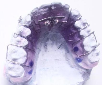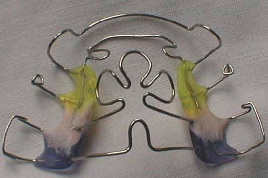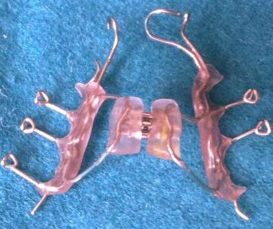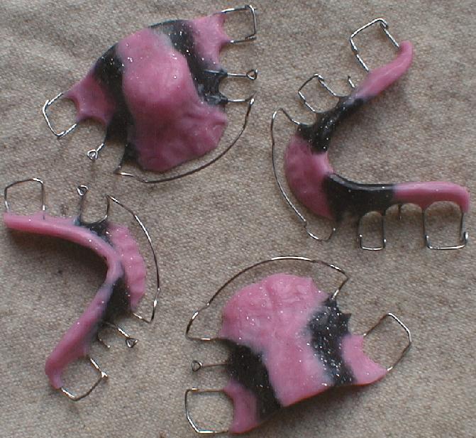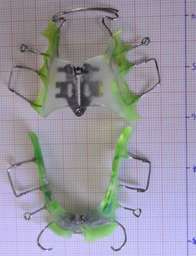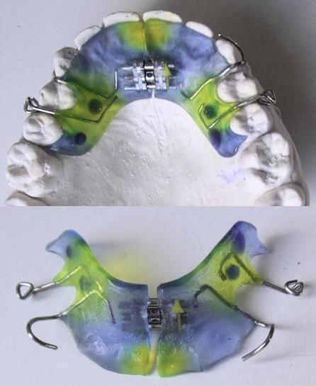 Auf Kundenwunsch (trotz Alternativen wie Schmalkiefer- oder Progenie-K3F): Platten für „Face pulling“ (wo Funktionskieferorthopädie wenig bekannt, aber Selbsthilfe ratsam ist)). |