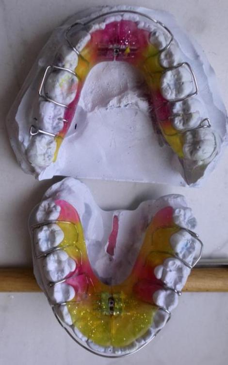 Removable expansion plates (European old school) were provided and already gave a noticeable expansion of 5 mm in both jaws (even if the bone of the lower is considered as harder, because denser). This took 27 months of regular wear, because mainly just at nighttime, but will be continued with fresh plates.