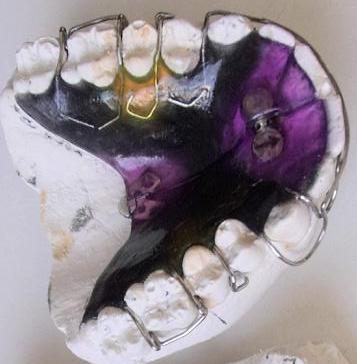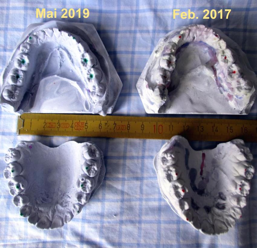 Eine Anwendung von Dehnplatten brachte bereits eine sichtbare und spürbare Verbreiterung von 5 mm in beiden Zahnbögen. Weil die Platten zwar regelmäßig, aber fast nur nachts getragen wurden, ging dieses „Ausbeulen“ der Zahnbögen langsam. Sie wirken bereits ansehnlich groß, aber die Expansion soll mit frischen Platten weiter ausgereizt werden.
